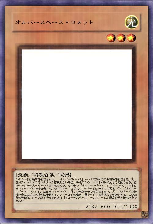 | このカードは通常召喚できない。「オルバースペース」カードの効果でのみ特殊召喚できる。①:自分フィールドにモンスターが存在しない場合、手札のこのカードを相手に見せて発動できる。自分のデッキの上からカードを4枚めくる。その中の「オルバースペース・オブザーバー」1体を自分フィールドに特殊召喚する。残りのカードと手札のこのカードはデッキに戻す。②:「オルバースペース・コメット」は自分フィールドに1体しか表側表示で存在できない。③:このカードが特殊召喚に成功した場合に発動する。フィールドの魔法・罠カード1枚を選んで破壊できる。この効果の発動後、ターン終了時まで自分は「オルバースペース」モンスターしか通常召喚・特殊召喚できない。 | |||