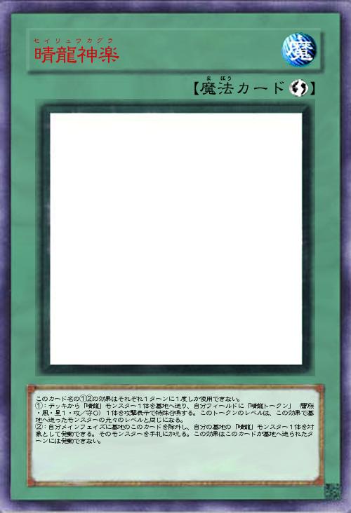 | このカード名の①②の効果はそれぞれ1ターンに1度しか使用できない。 ①:デッキから「晴龍」モンスター1体を墓地へ送り、自分フィールドに「晴龍トークン」(雷族・風・星1・攻/守0)1体を攻撃表示で特殊召喚する。このトークンのレベルは、この効果で墓地へ送ったモンスターの元々のレベルと同じになる。 ②:自分メインフェイズに墓地のこのカードを除外し、自分の墓地の「晴龍」モンスター1体を対象として発動できる。そのモンスターを手札に加える。この効果はこのカードが墓地へ送られたターンには発動できない。 | |||