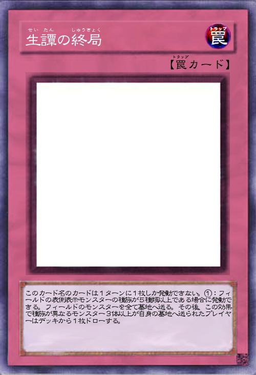 | このカード名のカードは1ターンに1枚しか発動できない。①:フィールドの表側表示モンスターの種族が5種類以上である場合に発動できる。フィールドのモンスターを全て墓地へ送る。その後、この効果で種族が異なるモンスター3体以上が自身の墓地へ送られたプレイヤーはデッキから1枚ドローする。 | |||