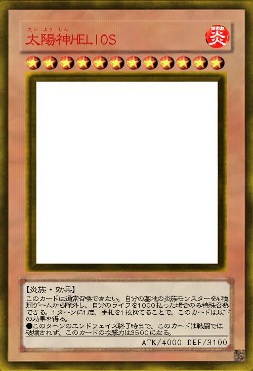 このカードは通常召喚できない。自分の墓地の炎族モンスターを4種類ゲームから除外し、自分のライフを1000払った場合のみ特殊召喚できる。1ターンに1度、手札を1枚捨てることで、このカードは以下の効果を得る。 ●このターンのエンドフェイズ終了時まで、このカードは戦闘では破壊されず、このカードの攻撃力は3500になる。 |