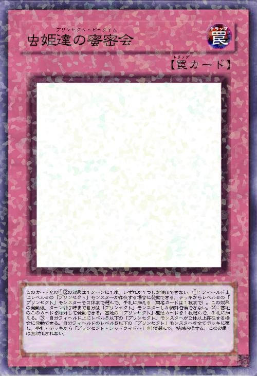 | このカード名の①②の効果は1ターンに1度、いずれか1つしか使用できない。①:フィールド上にレベル5の「プリンセクト」モンスターが存在する場合に発動できる。デッキからレベル5の「プリンセクト」モンスターを2体まで選んで、手札に加える(同名カードは1枚まで)。この効果の発動後、ターン終了時まで自分は「プリンセクト」モンスターしか特殊召喚できない。②:墓地のこのカードを除外して発動できる。墓地の「プリンセクト」魔法カードを1枚選んで、手札に加える。③:自分フィールド上にレベル5以下の「プリンセクト」モンスターが2体以上存在する場合に発動できる。自分フィールドのレベル5以下の「プリンセクト」モンスターを全てデッキに戻し、手札・デッキから「プリンセクト・シャドウィドー」を1体選んで、特殊召喚する。この効果は無効化されない。 | |||