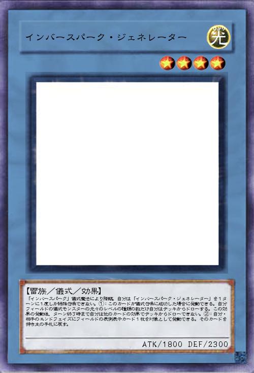 | 「インバースパーク」儀式魔法により降臨。自分は「インバースパーク・ジェネレーター」を1ターンに1度しか特殊召喚できない。①:このカードが儀式召喚に成功した場合に発動できる。自分フィールドの儀式モンスターの元々のレベルの種類の数だけ自分はデッキからドローする。この効果の発動後、ターン終了時まで自分は他のカードの効果でデッキからドローできない。②:自分・相手のエンドフェイズにフィールドの表側表示カード1枚を対象として発動できる。そのカードを持ち主の手札に戻す。 | |||