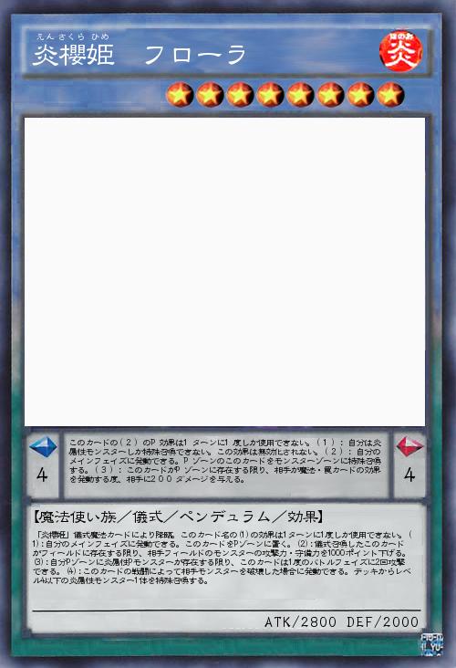 | 「炎櫻姫」儀式魔法カードにより降臨。このカード名の(1)の効果は1ターンに1度しか使用できない。(1):自分のメインフェイズに発動できる。このカードをPゾーンに置く。(2):儀式召喚したこのカードがフィールドに存在する限り、相手フィールドのモンスターの攻撃力・守備力を1000ポイント下げる。(3):自分Pゾーンに炎属性Pモンスターが存在する限り、このカードは1度のバトルフェイズに2回攻撃できる。(4):このカードの戦闘によって相手モンスターを破壊した場合に発動できる。デッキからレベル4以下の炎属性モンスター1体を特殊召喚する。 | |||