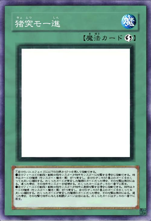 | ①自分のバトルフェイズに以下の効果から1つを選んで発動できる。 ●自分フィールドの獣族・獣戦士族モンスターが相手モンスターに攻撃する場合に発動できる。相手はカードの種類(モンスター・魔法・罠)を1つ宣言し、自分のデッキの1番上のカードをめくってお互いに確認する。めくったカードが宣言した種類のカードだった場合、その攻撃は無効になる。違った場合、その相手モンスターを破壊する。めくったカードはデッキの一番下に戻す。 ●自分フィールドの獣族・獣戦士族モンスターが相手に直接攻撃する場合に発動できる。相手はカードの種類(モンスター・魔法・罠)を1つ宣言し、自分のデッキの1番上のカードをめくってお互いに確認する。めくったカードが宣言した種類のカードだった場合、その攻撃は無効になる。違った場合、その攻撃で相手に与える戦闘ダメージは倍になる。めくったカードはデッキの一番下に戻す。 | |||