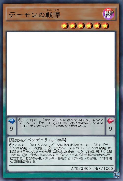 「Pモンスターにリメイクされたデーモンの召喚。デーモンの召喚が相手モンスターを戦闘破壊した際に再攻撃できる効果、P効果はデーモンの召喚と悪魔族に魔法カードへの耐性付加にしてあります。」(2021-01-30 11:24)