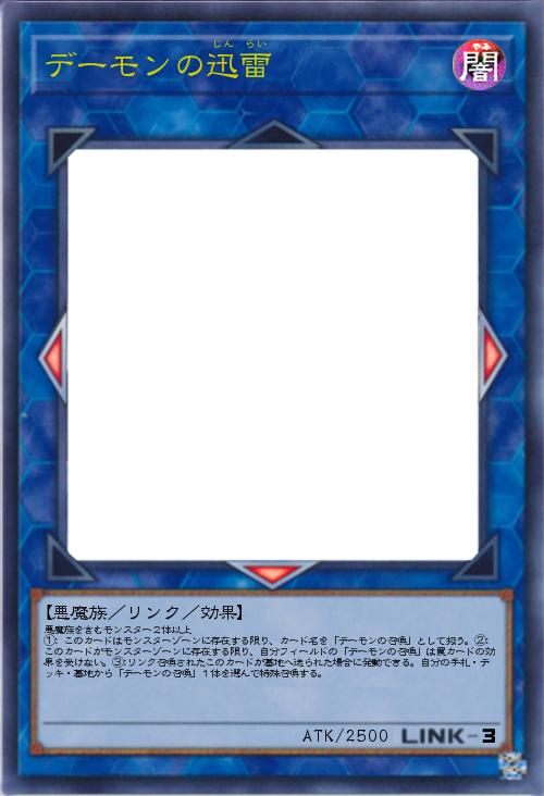 | 悪魔族を含むモンスター2体以上 ①: このカードはモンスターゾーンに存在する限り、カード名を「デーモンの召喚」として扱う。②:このカードがモンスターゾーンに存在する限り、自分フィールドの「デーモンの召喚」は罠カードの効果を受けない。③:リンク召喚されたこのカードが墓地へ送られた場合に発動できる。自分の手札・デッキ・墓地から「デーモンの召喚」1体を選んで特殊召喚する。 | |||