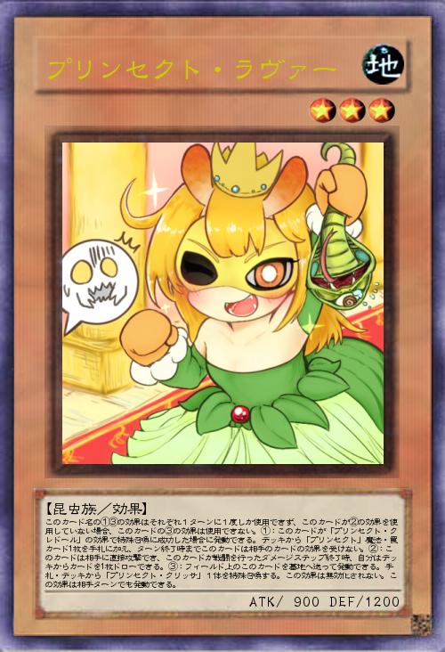 「2体目のお姫様です。赤ん坊のころから変わって活発に育つわんぱくなお姫様。恋心にも突き動かされ、好きな虫(ナイトさん)に変なモンスターを渡してきたりもする。クレドール(卵)→ラヴァー(幼虫)→クリッサ(サナギ)と、ちゃんとした召喚手順で出していかないと効果が使えなかったり上級プリンセクトを召喚できない等、出すまでに手間をかけ、完成した場合の莫大なアドを作りたいのがこのカテゴリです。考えるの難しい。次回のクリッサは恋が破れた後の引きこもりというか、お姫様らしからぬ引きこもりっぽい感じのお姫様にしようかと思います。なのでまたしばらくサポートなどで茶を濁します。絵も忙しいんであまり手は込まないものにしたいなぁ・・・」(2021-01-31 06:29)