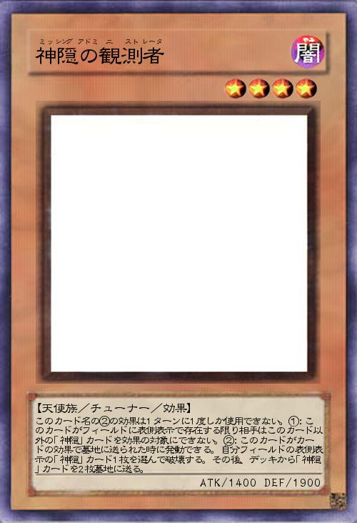 | このカード名の②の効果は1ターンに1度しか使用できない。①:このカードがフィールドに表側表示で存在する限り相手はこのカード以外の「神隠」カードを効果の対象にできない。②:このカードがカードの効果で墓地に送られた時に発動できる。自分フィールドの表側表示の「神隠」カード1枚を選んで破壊する。その後、デッキから「神隠」カードを2枚墓地に送る。 | |||