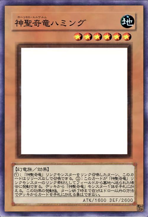 | ①:「神聖奇竜」リンクモンスターをリンク召喚したターン、このカードはリリースなしで召喚できる。②:このカードが「神聖奇竜」リンクモンスターのリンク素材としてフィールドから墓地へ送られた場合に発動できる。デッキから「神聖奇竜」モンスター1体を手札に加える。この効果の発動後、ターン終了時まで自分はドロー以外の方法でデッキからカードを手札に加える事はできない。 | |||