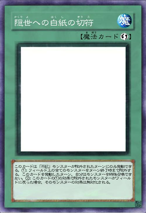 | このカードは「不記」モンスターが除外されたターンにのみ発動できる。①:フィールド上の全てのモンスターをターン終了時まで除外する。このカードを発動したターン、自分はモンスターを特殊召喚できない。②:このカードの①の効果で除外されたモンスターがフィールドに戻った場合、そのモンスターの効果は無効化される。 | |||