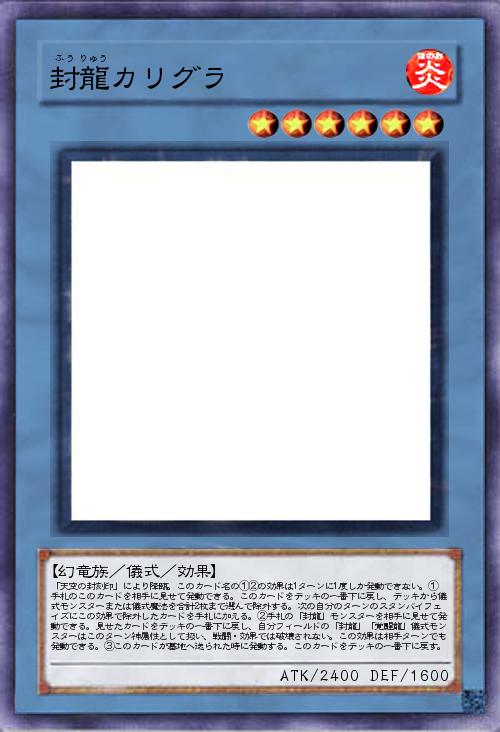 | 「天空の封刻印」により降臨。このカード名の①②の効果は1ターンに1度しか発動できない。①手札のこのカードを相手に見せて発動できる。このカードをデッキの一番下に戻し、デッキから儀式モンスターまたは儀式魔法を合計2枚まで選んで除外する。次の自分のターンのスタンバイフェイズにこの効果で除外したカードを手札に加える。②手札の「封龍」モンスターを相手に見せて発動できる。見せたカードをデッキの一番下に戻し、自分フィールドの「封龍」「覚醒龍」儀式モンスターはこのターン神属性として扱い、戦闘・効果では破壊されない。この効果は相手ターンでも発動できる。③このカードが墓地へ送られた時に発動する。このカードをデッキの一番下に戻す。 | |||
