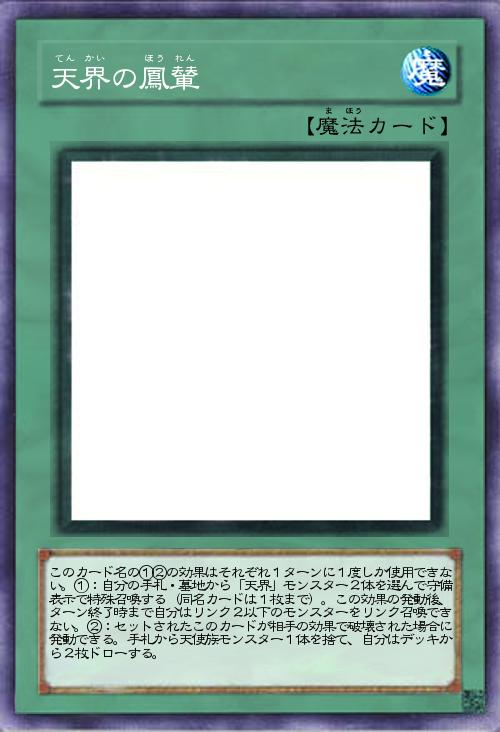 | このカード名の①②の効果はそれぞれ1ターンに1度しか使用できない。①:自分の手札・墓地から「天界」モンスター2体を選んで守備表示で特殊召喚する(同名カードは1枚まで)。この効果の発動後、ターン終了時まで自分はリンク2以下のモンスターをリンク召喚できない。②:セットされたこのカードが相手の効果で破壊された場合に発動できる。手札から天使族モンスター1体を捨て、自分はデッキから2枚ドローする。 | |||