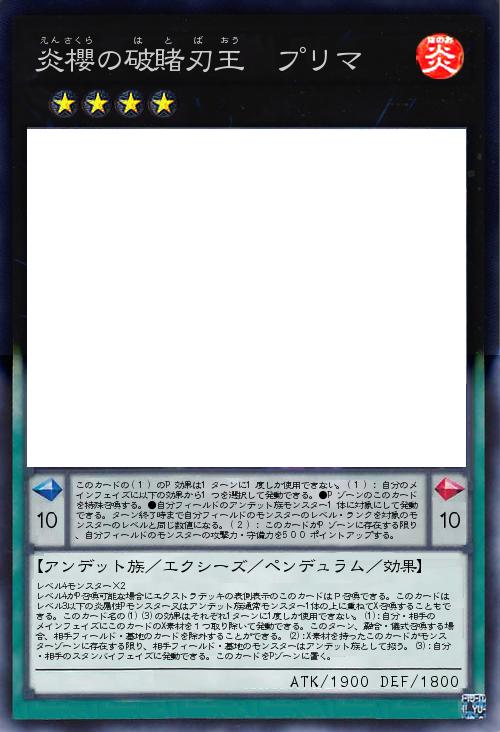 | レベル4モンスター×2 レベル4がP召喚可能な場合にエクストラデッキの表側表示のこのカードはP召喚できる。このカードはレベル3以下の炎属性Pモンスター又はアンデット族通常モンスター1体の上に重ねてX召喚することもできる。このカード名の(1)(3)の効果はそれぞれ1ターンに1度しか使用できない。(1):自分・相手のメインフェイズにこのカードのX素材を1つ取り除いて発動できる。このターン、融合・儀式召喚する場合、相手フィールド・墓地のカードを除外することができる。(2):X素材を持ったこのカードがモンスターゾーンに存在する限り、相手フィールド・墓地のモンスターはアンデット族として扱う。(3):自分・相手のスタンバイフェイズに発動できる。このカードをPゾーンに置く。 | |||