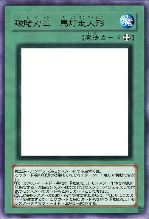 | 戦士族・アンデット族モンスターにのみ装備可能。 このカード名の①③の効果はそれぞれ1ターンに1度しか発動できない。 ①:自分のフィールド・墓地の「破賭刃王」モンスター1体を対象に発動できる。装備モンスターは次の自分のスタンバイフェイズまで対象のモンスターのカード名と同じカードとしても扱う。 ②:装備モンスターが戦闘・効果で破壊される場合、代わりにこのカードを破壊するか、このカードと同じカード名を持つ「破賭刃王」モンスターを自分フィールド・墓地から除外する。 | |||