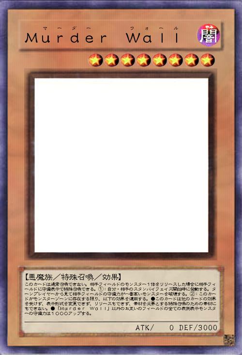 | このカードは通常召喚できない。相手フィールドのモンスター1体をリリースした場合に相手フィールドに守備表示で特殊召喚できる。①:自分・相手のスタンバイフェイズ開始時に発動する。ターンプレイヤーから見て相手フィールドの守備力が一番高いモンスターを破壊する。②:このカードがモンスターゾーンに存在する限り、以下の効果を適用する。●このカードは他のカードの効果を受けず、表示形式を変更できず、リリースもできず、素材を必要とする特殊召喚のための素材にもできない。●「Murder Wall」以外のお互いのフィールドの全ての表側表示モンスターの守備力は1000アップする。 | |||