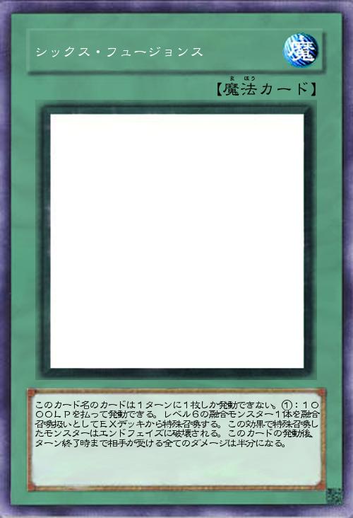 | このカード名のカードは1ターンに1枚しか発動できない。①:1000LPを払って発動できる。レベル6の融合モンスター1体を融合召喚扱いとしてEXデッキから特殊召喚する。この効果で特殊召喚したモンスターはエンドフェイズに破壊される。このカードの発動後、ターン終了時まで相手が受ける全てのダメージは半分になる。 | |||