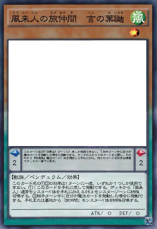 | このカード名の①②の効果は1ターンに一度、いずれか1つしか使用できない。①:このカードを手札に戻して発動できる。デッキから「風来人」通常モンスター1体を手札に加えるかEXモンスターゾーンに特殊召喚する。②相手ターン中に自分が魔法カードを発動した場合に発動できる。手札または墓地から「旅仲間」モンスター1体を特殊召喚する。 | |||
