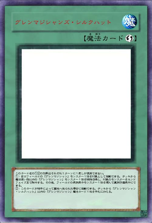 | このカード名の①②の効果はそれぞれ1ターンに1度しか使用できない。 ①:自分フィールドの「グレンマジシャン」モンスター1体を対象として発動できる。デッキから魔法使い族以外の「グレンマジシャン」モンスター1体を特殊召喚し、対象のモンスターをエンドフェイズまで除外する。その後、フィールドの表側表示モンスター1体を選んで裏側守備表示にできる。 ②:このカードが相手によって墓地へ送られた場合に発動できる。デッキから「グレンマジシャン・シルクハット」以外の「グレンマジシャン」魔法カード1枚を手札に加える。 | |||