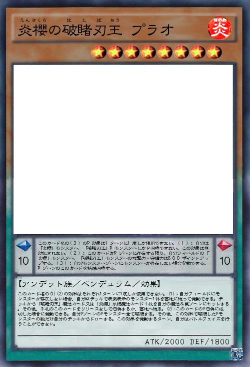 | このカード名の(1)(2)の効果はそれぞれ1ターンに1度しか使用できない。(1):自分フィールドにモンスターが存在しない場合、自分EXデッキで表側表示のモンスター1体を墓地に送って発動できる。デッキから「破賭刃王」魔法カード又は「炎櫻」永続魔法カード1枚を自分の魔法&罠ゾーンにセットする。その後、手札のこのカードをリリースなしで召喚するか、墓地へ送る。(2):このカードのP召喚に成功した場合に発動できる。自分PゾーンのPモンスター全て破壊する。その後、この効果で破壊したPモンスターの数だけ自分のデッキからドローする。この効果を発動するターン、自分はバトルフェイズを行うことができない。 | |||
