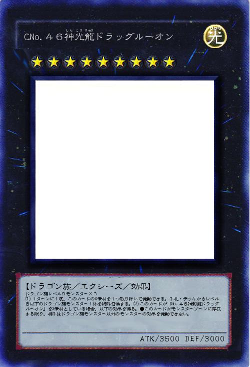 「ドラッグルーオンのCNo.版です。特殊召喚できるドラゴン族がレベル8以下に限定される代わりにデッキからもリクルートでき、付加効果はドラゴン族以外のモンスター効果の発動を封殺するものにしてあります。」(2021-02-16 00:33)