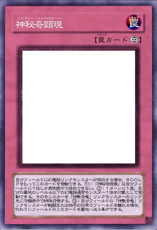 | 自分フィールドに幻竜族リンクモンスターが存在する場合、800LPを払ってこのカードを発動できる。①:「神秘奇現像」は自分フィールドに1枚しか表側表示で存在できない。②:1ターンに1度、自分の墓地のレベル4以下の幻竜族通常モンスター1体を対象として発動できる。そのモンスターを「神聖奇竜」リンクモンスターのリンク先に守備表示で特殊召喚する。③:自分フィールドの「神聖奇竜」リンクモンスターが戦闘または相手の効果でフィールドを離れる場合、代わりにフィールドのこのカードを墓地へ送る事ができる。 | |||