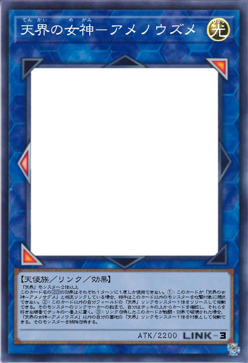 | 「天界」モンスター2体以上 このカード名の②③の効果はそれぞれ1ターンに1度しか使用できない。①:このカードが「天界の女神-アメノサグメ」と相互リンクしている場合、相手はこのカード以外のモンスターを攻撃対象に選択できない。②:このカード以外の自分フィールドの「天界」リンクモンスター1体をリリースして発動できる。そのモンスターのリンクマーカーの数まで、自分はデッキの上からカードを確認し、それらを好きな順番でデッキの一番上に置く。③:リンク召喚したこのカードが戦闘・効果で破壊された場合、「天界の女神-アメノウズメ」以外の自分の墓地の「天界」リンクモンスター1体を対象として発動できる。そのモンスターを特殊召喚する。 | |||