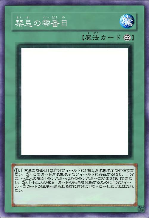 | ①:「禁忌の零番目」は自分フィールドに1枚しか表側表示で存在できない。②:このカードが表側表示でフィールドに存在する限り、自分は「十三人の魔女」モンスター以外のモンスターの効果を使用できない。③:「十三人の魔女」カードの効果を発動するために自分フィールドのカードが墓地へ送られる度に自分は1枚ドローしなければなれない。 | |||