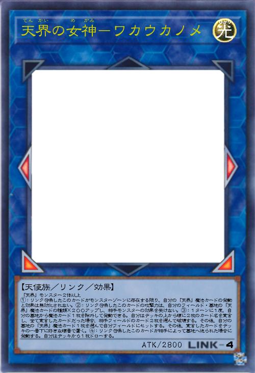 | 「天界」モンスター2体以上 ①:リンク召喚したこのカードがモンスターゾーンに存在する限り、自分の「天界」魔法カードの発動と効果は無効化されない。②:リンク召喚したこのカードの攻撃力は、自分のフィールド・墓地の「天界」魔法カードの種類×200アップし、相手モンスターの効果を受けない。③:1ターンに1度、自分の墓地から魔法カード1枚を除外して発動できる。自分はデッキの上から順に2枚のカード名を宣言し、全て宣言したカードだった場合、相手フィールドのカード2枚を選んで破壊する。その後、自分の墓地の「天界」魔法カード1枚を選んで自分フィールドにセットする。その後、宣言したカードをデッキの一番下に好きな順番で置く。④:リンク召喚したこのカードが相手によって墓地へ送られた場合に発動する。自分はデッキから1枚ドローする。 | |||