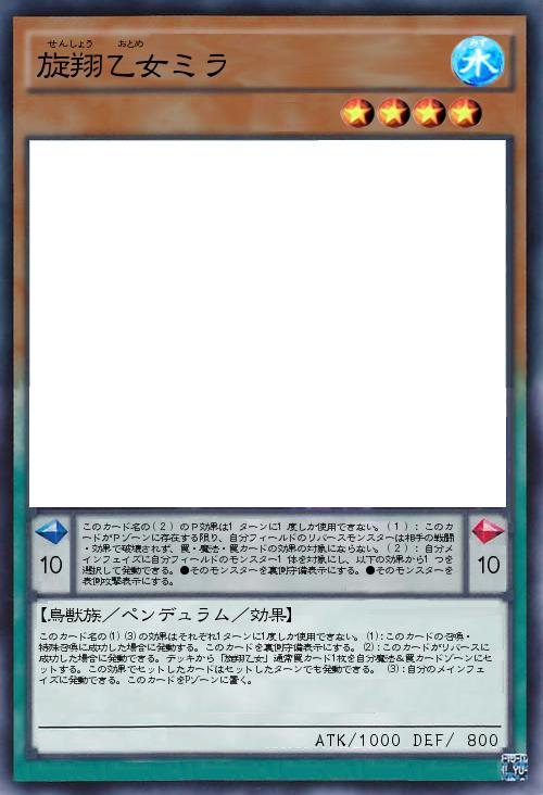 | このカード名の(1)(3)の効果はそれぞれ1ターンに1度しか使用できない。(1):このカードの召喚・特殊召喚に成功した場合に発動する。このカードを裏側守備表示にする。(2):このカードがリバースに成功した場合に発動できる。デッキから「旋翔乙女」通常罠カード1枚を自分魔法&罠カードゾーンにセットする。この効果でセットしたカードはセットしたターンでも発動できる。 (3):自分のメインフェイズに発動できる。このカードをPゾーンに置く。 | |||