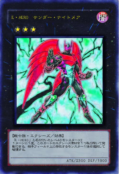 | 「E・HERO」と名の付いたレべル3モンスター×2 1ターンに1度、このカードのエクシーズ素材を1つ取り除いて発動できる。相手フィールド上に存在するモンスター1体を選択して破壊する。 | |||