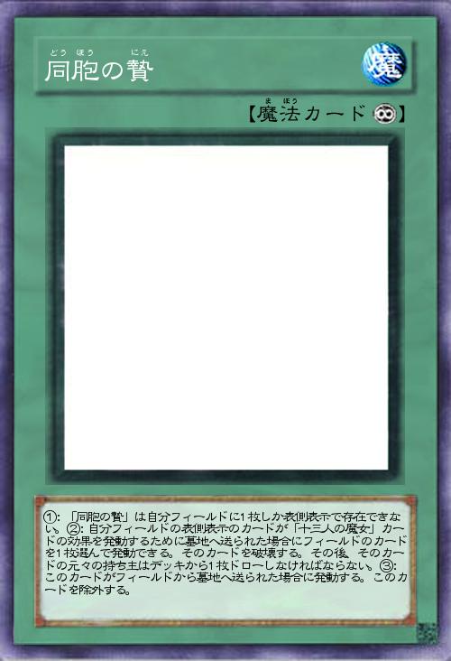 | ①:「同胞の贄」は自分フィールドに1枚しか表側表示で存在できない。②:自分フィールドの表側表示のカードが「十三人の魔女」カードの効果を発動するために墓地へ送られた場合にフィールドのカードを1枚選んで発動できる。そのカードを破壊する。その後、そのカードの元々の持ち主はデッキから1枚ドローしなければならない。③:このカードがフィールドから墓地へ送られた場合に発動する。このカードを除外する。 | |||