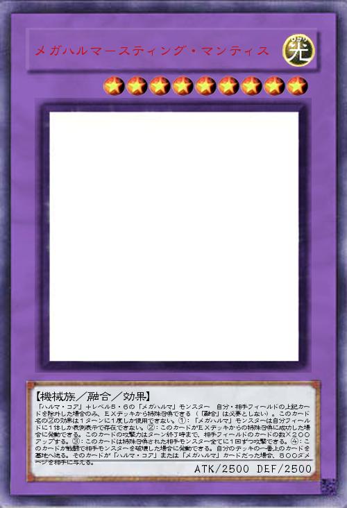 | 「ハルマ・コア」+レベル5・6の「メガハルマ」モンスター 自分・相手フィールドの上記カードを除外した場合のみ、EXデッキから特殊召喚できる(「融合」は必要としない)。このカード名の②の効果は1ターンに1度しか使用できない。①:「メガハルマ」モンスターは自分フィールドに1体しか表側表示で存在できない。②:このカードがEXデッキからの特殊召喚に成功した場合に発動できる。このカードの攻撃力はターン終了時まで、相手フィールドのカードの数×200アップする。③:このカードは特殊召喚された相手モンスター全てに1回ずつ攻撃できる。④:このカードが戦闘で相手モンスターを破壊した場合に発動できる。自分のデッキの一番上のカードを墓地へ送る。そのカードが「ハルマ・コア」または「メガハルマ」カードだった場合、800ダメージを相手に与える。 | |||