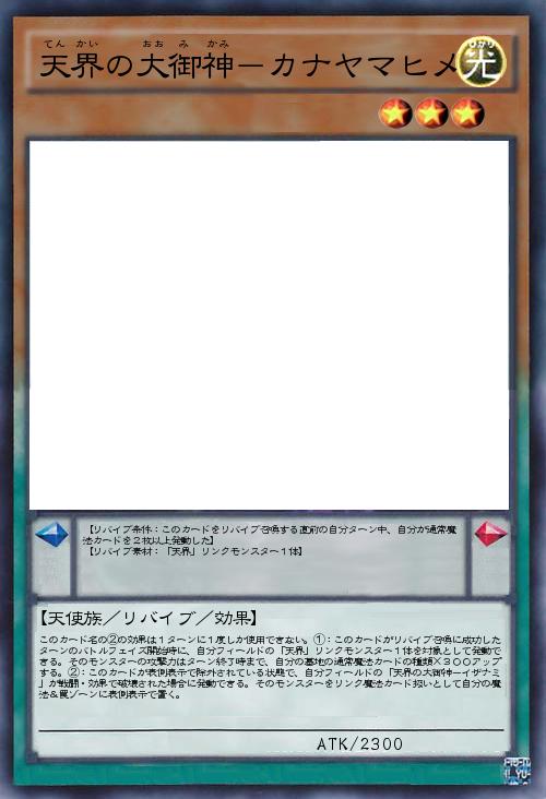 | このカード名の②の効果は1ターンに1度しか使用できない。①:このカードがリバイブ召喚に成功したターンのバトルフェイズ開始時に、自分フィールドの「天界」リンクモンスター1体を対象として発動できる。そのモンスターの攻撃力はターン終了時まで、自分の墓地の通常魔法カードの種類×300アップする。②:このカードが表側表示で除外されている状態で、自分フィールドの「天界の大御神-イザナミ」が戦闘・効果で破壊された場合に発動できる。そのモンスターをリンク魔法カード扱いとして自分の魔法&罠ゾーンに表側表示で置く。 | |||