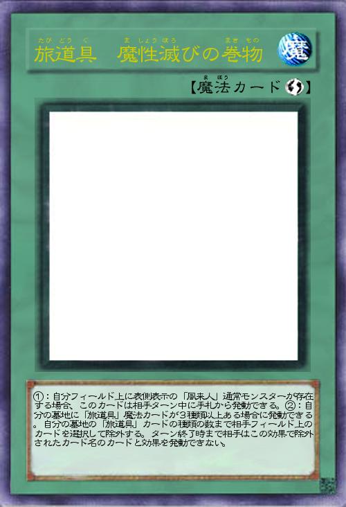 | ①:自分フィールド上に表側表示の「風来人」通常モンスターが存在する場合、このカードは相手ターン中に手札から発動できる。②:自分の墓地に「旅道具」魔法カードが3種類以上ある場合に発動できる。自分の墓地の「旅道具」カードの種類の数まで相手フィールド上のカードを選択して除外する。ターン終了時まで相手はこの効果で除外されたカード名のカードと効果を発動できない。 | |||
