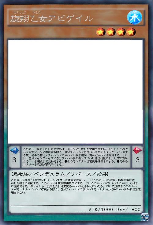 | このカード名の(1)の効果は1ターンに1度しか使用できない。(1):このカードの召喚・特殊召喚に成功した場合に発動する。このカードを裏側守備表示にする。(2):このカードがリバースに成功した場合に発動できる。デッキから「旋翔乙女」通常魔法カード1枚を手札に加える。(3):表側表示のこのカードがモンスターゾーンに存在する限り、自分フィールドのリバースモンスターは相手のカード効果では破壊されない。 | |||