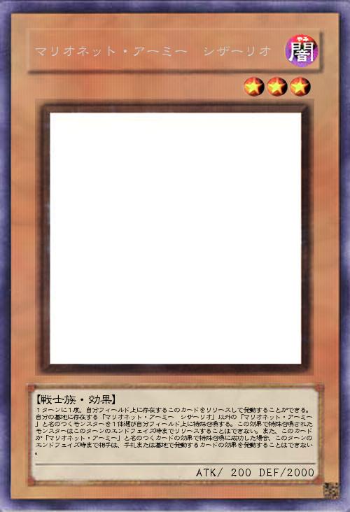 | 1ターンに1度、自分フィールド上に存在するこのカードをリリースして発動することができる。自分の墓地に存在する「マリオネット・アーミー シザーリオ」以外の「マリオネット・アーミー」と名のつくモンスターを1体選び自分フィールド上に特殊召喚する。この効果で特殊召喚されたモンスターはこのターンのエンドフェイズ時までリリースすることはできない。また、このカードが「マリオネット・アーミー」と名のつくカードの効果で特殊召喚に成功した場合、このターンのエンドフェイズ時まで相手は、手札または墓地で発動するカードの効果を発動することはできない。 | |||