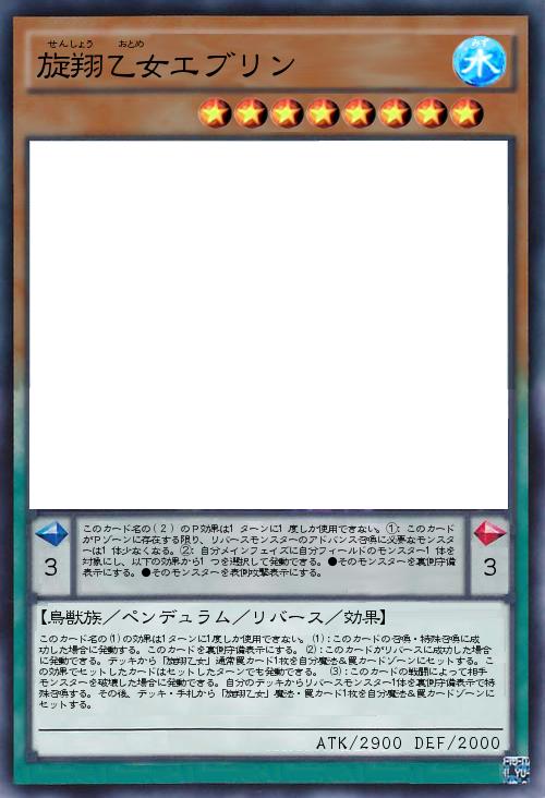 | このカード名の(1)の効果は1ターンに1度しか使用できない。(1):このカードの召喚・特殊召喚に成功した場合に発動する。このカードを裏側守備表示にする。(2):このカードがリバースに成功した場合に発動できる。デッキから「旋翔乙女」通常罠カード1枚を自分魔法&罠カードゾーンにセットする。この効果でセットしたカードはセットしたターンでも発動できる。 (3):このカードの戦闘によって相手モンスターを破壊した場合に発動できる。自分のデッキからリバースモンスター1体を裏側守備表示で特殊召喚する。その後、デッキ・手札から「旋翔乙女」魔法・罠カード1枚を自分魔法&罠カードゾーンにセットする。 | |||