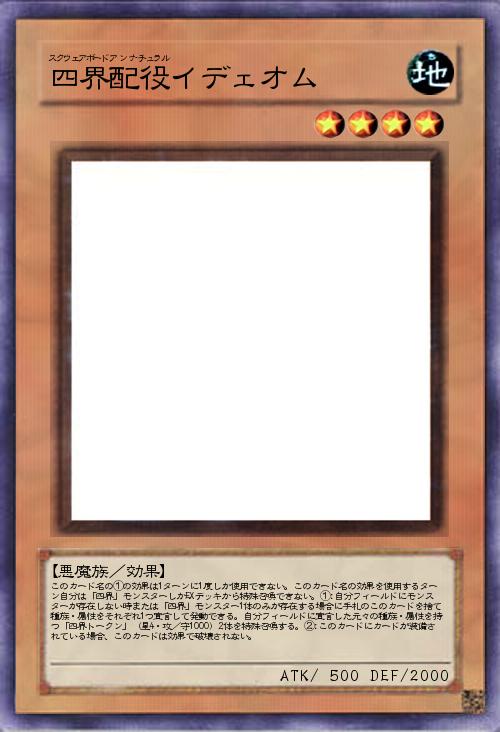 | このカード名の①の効果は1ターンに1度しか使用できない。このカード名の効果を使用するターン自分は「四界」モンスターしかEXデッキから特殊召喚できない。①:自分フィールドにモンスターが存在しない時または「四界」モンスター1体のみが存在する場合に手札のこのカードを捨て種族・属性をそれぞれ1つ宣言して発動できる。自分フィールドに宣言した元々の種族・属性を持つ「四界トークン」(星4・攻/守1000)2体を特殊召喚する。②:このカードにカードが装備されている場合、このカードは効果で破壊されない。 | |||
