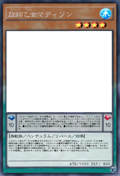 | このカード名の(1)(3)の効果はそれぞれ1ターンに1度しか使用できない。(1):このカードの召喚・特殊召喚に成功した場合に発動する。このカードを裏側守備表示にする。(2):このカードがリバースに成功した場合に自分EXデッキで表側表示のリバースモンスター1体を対象にして発動できる。そのモンスターを裏側守備表示で特殊召喚する。(3):自分のメインフェイズに発動できる。フィールドのこのカードを破壊し、自分のデッキから「旋翔乙女」魔法・罠カード1枚を手札に加える。 | |||