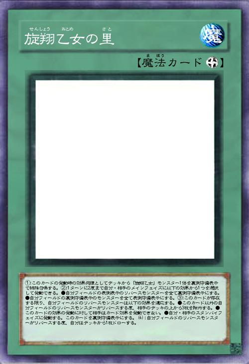 | ①:このカードの発動時の効果処理としてデッキから「旋翔乙女」モンスター1体を裏側守備表示で特殊召喚する。②:1ターンに2度まで自分・相手のメインフェイズに以下の効果から1つを選択して発動できる。●自分フィールドの表側表示のリバースモンスターを全て裏側守備表示にする。●自分フィールドの裏側守備表示のモンスターを全て表側守備表示にする。③:このカードが存在する限り、自分フィールドのリバースモンスターは以下の効果を適応する。●このカード以外の自分フィールドのリバースモンスターがリバースする度、相手のデッキの上から3枚を除外する。●このカードの効果の発動に対して相手はカード効果を発動できない。●自分・相手のスタンバイフェイズに発動する。このカードを裏側守備表示にする。(4):自分フィールドのリバースモンスターがリバースする度、自分はデッキから1枚ドローする。 | |||