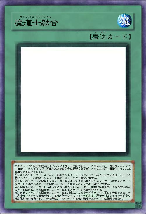 | このカードの①②③の効果は1ターンに1度しか発動できない。このカードは、自分フィールドに「魔道士」モンスターがいる場合のみ発動と効果処理かできる。このカードは「魔道士」フィールド魔法の制限を受けない。 ①:自分の手札・フィールドから、融合モンスターカードによって決められたモンスターカードを墓地へ送り、その融合モンスター1体をEXデッキから融合召喚する。 ②:自分のPゾーンに融合モンスターカードによって決められたモンスターカードがあるとき、そのカードを墓地へ送り、その融合モンスター1体をEXデッキから融合召喚する。 ③:融合モンスターカードによって決められたモンスターカードが墓地にある時、その素材となるカードを除外し、その融合モンスター1体をEXデッキから融合召喚する。 ④:自分フィールドの融合モンスター1体を対象に、このカードをデッキへ戻して発動できる。その融合モンスターを墓地へ送り、墓地 | |||
