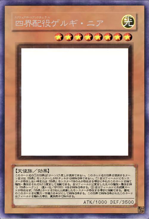 | このカード名の①の効果は1ターンに1度しか使用できない。このカード名の効果を使用するターン自分は「四界」モンスターしかEXデッキから特殊召喚できない。①:自分フィールドにモンスターが存在しない時または「四界」モンスター1体のみが存在する場合に手札のこのカードを捨て種族・属性をそれぞれ1つ宣言して発動できる。自分フィールドに宣言した元々の種族・属性を持つ「四界トークン」(星4・攻/守1000)4体を特殊召喚する。②:自分フィールドに永続罠カードが存在せず、「四界」カードを2枚以上装備したモンスターが存在する場合に発動できる。墓地のこのカードを攻撃力・守備力を半分にして特殊召喚する。この効果で特殊召喚されたこのカードはフィールドを離れた場合、裏側表示で除外する。 | |||