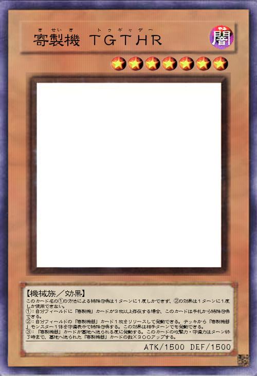 | このカード名の①の方法による特殊召喚は1ターンに1度しかできず、②の効果は1ターンに1度しか使用できない。 ①:自分フィールドに「寄製機」カードが3枚以上存在する場合、このカードは手札から特殊召喚できる。 ②:自分フィールドの「寄製機器」カード1枚をリリースして発動できる。デッキから「寄製機器」モンスター1体を守備表示で特殊召喚する。この効果は相手ターンでも発動できる。 ③:「寄製機器」カードが墓地へ送られる度に発動する。このカードの攻撃力・守備力はターン終了時まで、墓地へ送られた「寄製機器」カードの数×300アップする。 | |||