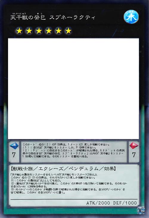 | このカード名の(2)のP効果は、1ターンに1度しか発動できない。 (1):自分は「天干獣」モンスターしか、P召喚できない。 (2):Pゾーンに存在するこのカードが破壊された場合、EXデッキの表側表示で存在する「天干獣の癸巳 スプネーラクティ」以外の「天干獣」モンスター1体選んで発動できる。そのモンスターを墓地へ送る。 | |||