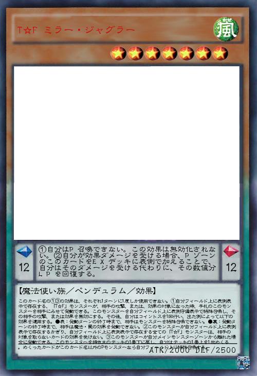 | ①自分はP召喚できない。この効果は無効化されない。②自分が効果ダメージを受ける場合、PゾーンのこのカードをEXデッキに表側で加えることで、自分はそのダメージを受ける代わりに、その数値分LPを回復する。 | |||