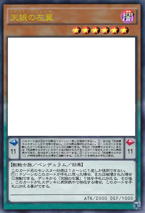 | このカード名のモンスター効果は1ターンに1度しか使用できない。 ①:Pゾーンのこのカードが手札に戻った場合、または破壊された場合に発動できる。デッキから「天狼の右翼」1体を手札に加える。その後、このカードがEXデッキに表側表示で存在する場合、このカードを手札に加える事ができる。 | |||