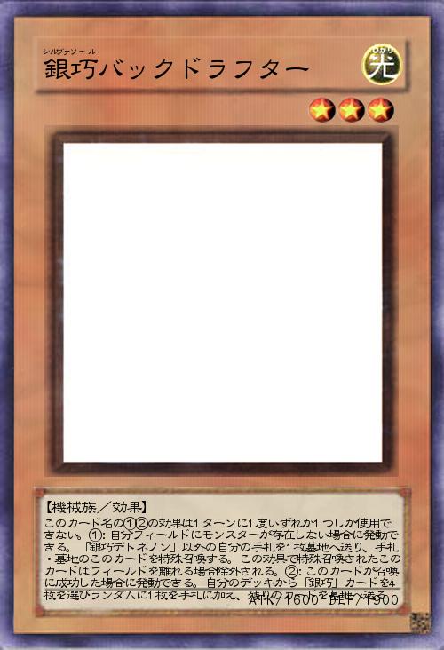 | このカード名の①②の効果は1ターンに1度いずれか1つしか使用できない。①:自分フィールドにモンスターが存在しない場合に発動できる。「銀巧デトネノン」以外の自分の手札を1枚墓地へ送り、手札・墓地のこのカードを特殊召喚する。この効果で特殊召喚されたこのカードはフィールドを離れる場合除外される。②:このカードが召喚に成功した場合に発動できる。自分のデッキから「銀巧」カードを4枚を選びランダムに1枚を手札に加え、残りのカードを墓地へ送る | |||