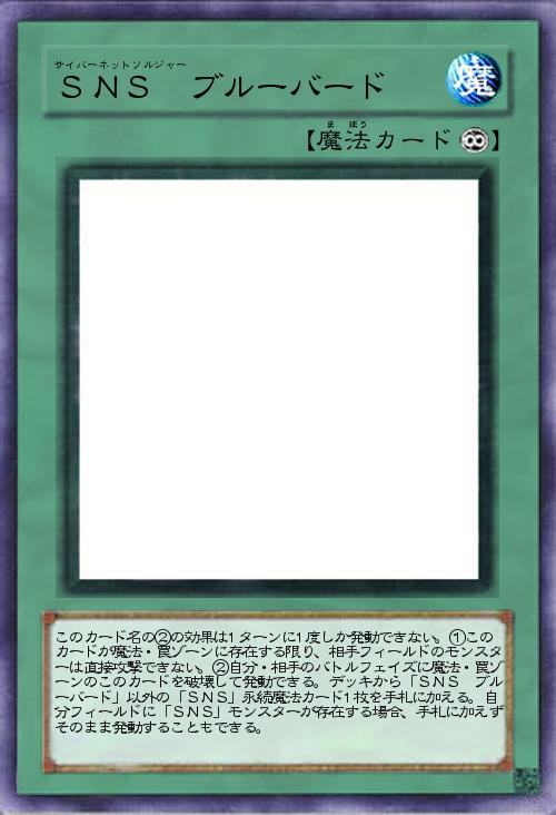 | このカード名の②の効果は1ターンに1度しか発動できない。①このカードが魔法・罠ゾーンに存在する限り、相手フィールドのモンスターは直接攻撃できない。②自分・相手のバトルフェイズに魔法・罠ゾーンのこのカードを破壊して発動できる。デッキから「SNS ブルーバード」以外の「SNS」永続魔法カード1枚を手札に加える。自分フィールドに「SNS」モンスターが存在する場合、手札に加えずそのまま発動することもできる。 | |||