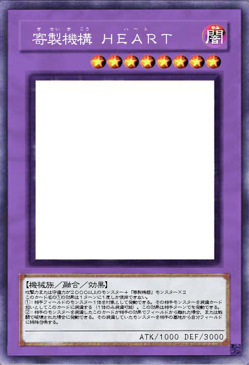 | 攻撃力または守備力が2000以上のモンスター+「寄製機器」モンスター×2 このカード名の①の効果は1ターンに1度しか使用できない。 ①:相手フィールドのモンスター1体を対象として発動できる。その相手モンスターを装備カード扱いとしてこのカードに装備する(1体のみ装備可能)。この効果は相手ターンでも発動できる。 ②:相手のモンスターを装備したこのカードが相手の効果でフィールドから離れた場合、または戦闘で破壊された場合に発動できる。その装備していたモンスターを相手の墓地から自分フィールドに特殊召喚する。 | |||