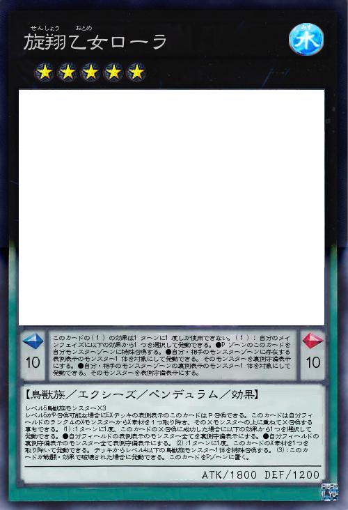 | レベル5鳥獣族モンスター×3 レベル5がP召喚可能な場合にEXデッキの表側表示のこのカードはP召喚できる。このカードは自分フィールドのランク4のXモンスターからX素材を1つ取り除き、そのXモンスターの上に重ねてX召喚する事もできる。(1):1ターンに1度、このカードのX召喚に成功した場合に以下の効果から1つを選択して発動できる。●自分フィールドの表側表示のモンスター全てを裏側守備表示にする。●自分フィールドの裏側守備表示のモンスター全て表側守備表示にする。(2):1ターンに1度、このカードのX素材を1つを取り除いて発動できる。デッキからレベル4以下の鳥獣族モンスター1体を特殊召喚する。(3):このカードが戦闘・効果で破壊された場合に発動できる。このカードをPゾーンに置く。 | |||